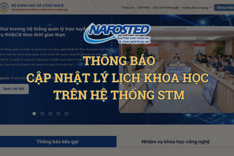 Kính gửi: Các nhà khoa học. Bộ Khoa học và Công nghệ đã khai trương Hệ thống quản lý trực tuyến nhiệm vụ khoa học và công nghệ (Hệ thống STM) tại địa chỉ https://stm.mst.gov.vn. Theo đó, thông tin lý lịch khoa học của các nhà khoa học trên Hệ thống https://e-services.nafosted.gov.vn do Quỹ Phát triển khoa học và công nghệ Quốc gia (NAFOSTED) quản lý đã được đồng bộ sang Hệ thống STM nêu trên. Các nhà khoa học có thể đăng nhập vào hệ thống một cách thuận tiện thông qua tài khoản VNeID để truy cập, quản lý và cập nhật thông tin cá nhân, cũng như theo dõi các nhiệm vụ khoa học và công nghệ có liên quan. Nhằm bảo đảm thông tin về đội ngũ nhà khoa học được cập nhật đầy đủ, chính xác, phục vụ hiệu quả cho công tác quản lý…