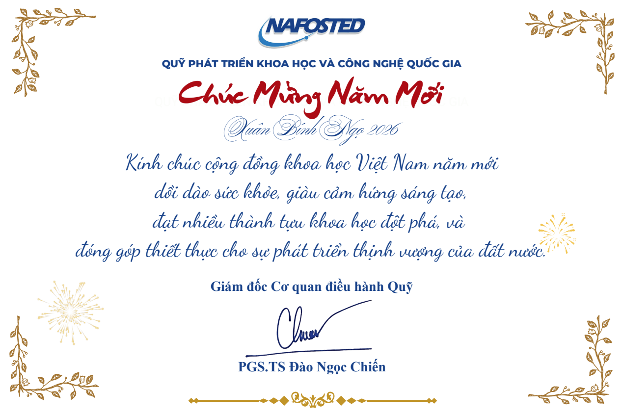 Chúc mừng năm mới Xuân Bính Ngọ 2026 14/02/2026 Kính chúc cộng đồng khoa học Việt Nam năm mới dồi dào sức khoẻ, giàu cảm hứng sáng tạo, đạt nhiều thành tựu khoa học đột phá và đóng góp thiết thực cho sự phát triển thịnh vượng của đất nước. Lượt xem: 882