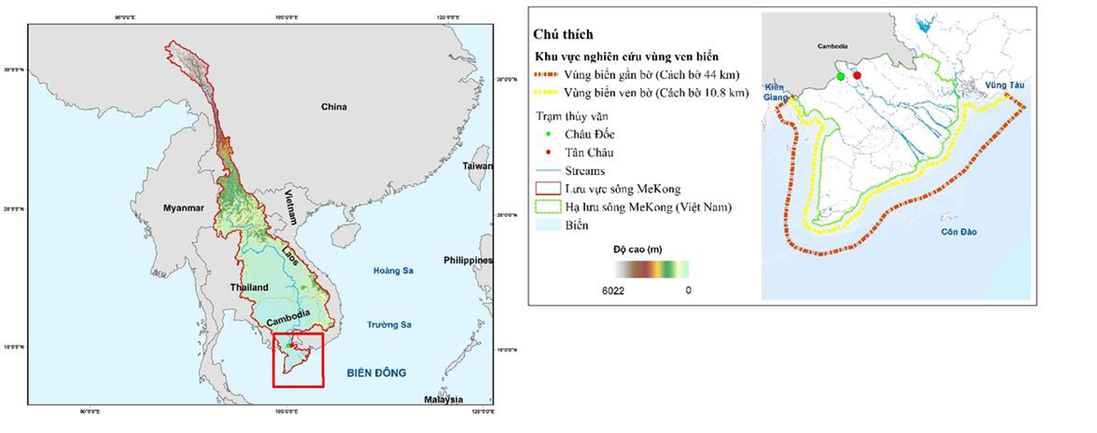 Hình 1: Bản đồ khu vực nghiên cứu ven biển Nam Bộ. Hộp đỏ (trái) thể hiện vị trí Đồng bằng sông Cửu Long (ĐBSCL) ở hạ lưu lưu vực sông Mê Công
