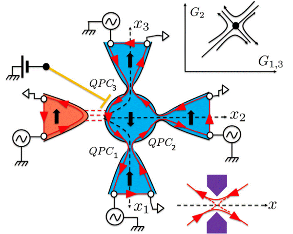 Trong loạt thí nghiệm do nhóm của GS. Frédéric Pierre thực hiện, dòng điện biên được tạo ra trong chế độ Hall lượng tử nguyên đóng vai trò chủ đạo. Hệ được duy trì trong trạng thái cân bằng nhiệt động cục bộ trong vùng máng, trong khi một điện cực bổ sung – gọi là nguồn – được liên kết yếu với chấm lượng tử và được duy trì ở nhiệt độ cao hơn. Sự chênh lệch nhiệt độ tại liên kết yếu này tạo điều kiện để khảo sát hiện tượng truyền dẫn nhiệt điện lượng tử. Tại liên kết yếu, điện tử có thể “chui ngầm” vào hoặc ra khỏi chấm lượng tử. Trong khi đó, tại các tiếp điểm lượng tử, điện tử thuộc dòng điện biên bị tán xạ: phần lớn truyền qua (đường liền nét trong hình vẽ), còn một phần nhỏ phản xạ ngược (đường đứt nét).