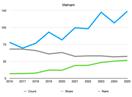 Hình 3 cho biết từ năm 2016 đến 2025, số bài báo Nature Index của Việt Nam (Count) tăng từ khoảng 70 đến gần 140 và số điểm Nature Index của Việt Nam (Share) tăng từ 9 đến 37. Sắp xếp theo Share, Việt Nam nâng hạng từ 60 đến 45 về chất lượng nghiên cứu.