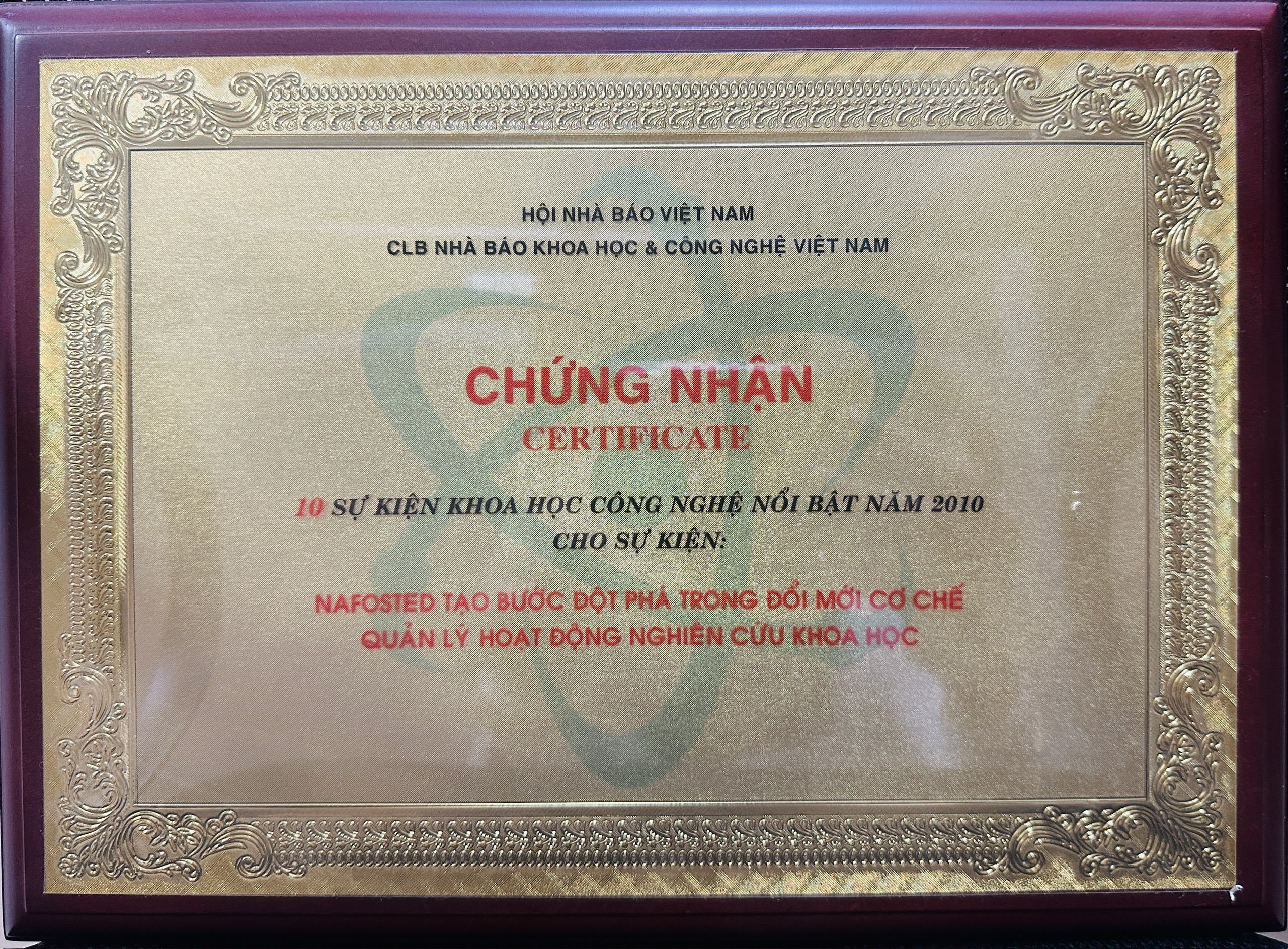 Ngày 29/12, tại Hà Nội, Câu lạc bộ Nhà báo khoa học và công nghệ – Hội nhà báo Việt Nam đã công bố kết quả cuộc bình chọn 10 sự kiện Khoa học Công nghệ nổi bật năm 2010 do các nhà báo trong lĩnh vực KH&CN trên cả nước bình chọn. Trong 10 sự kiện KH&CN được bình chọn năm nay, có 2 sự kiện thuộc lĩnh vực cơ chế chính sách; 2 sự kiện thuộc lĩnh vực khoa học xã hội và nhân văn; 4 sự kiện thuộc lĩnh vực khoa học ứng dụng; 1 sự kiện thuộc lĩnh vực hội nhập quốc tế về KH&CN và 1 sự kiện thuộc lĩnh vực tôn vinh các nhà khoa học.