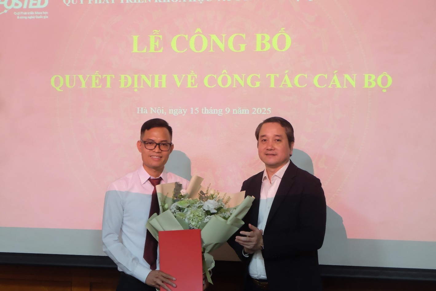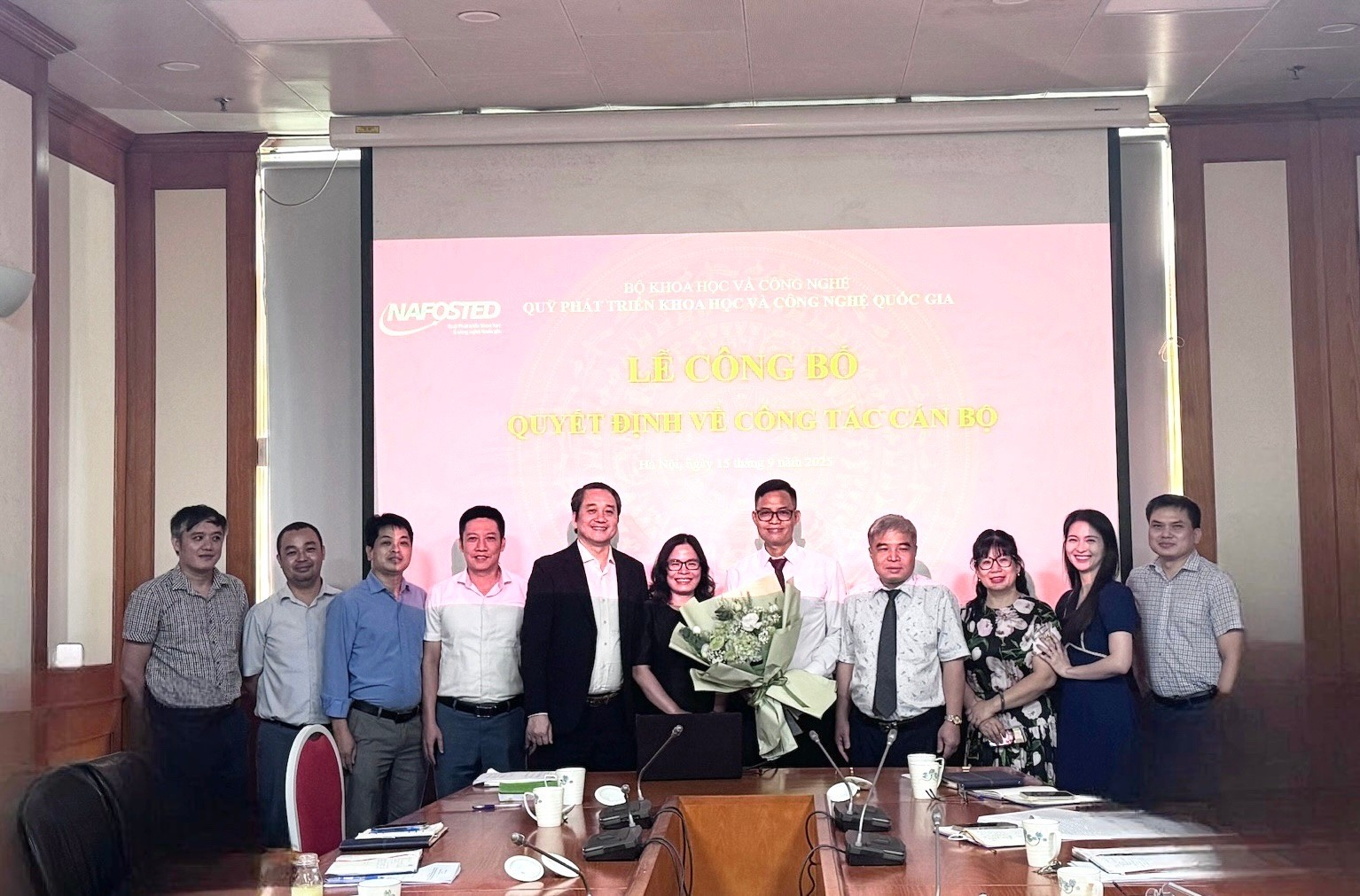 Ngày 15/9/2025, Quỹ Phát triển khoa học và công nghệ Quốc gia (NAFOSTED) đã long trọng tổ chức lễ công bố và trao quyết định bổ nhiệm Phó Trưởng phòng, Phòng Quản lý Phát triển Công nghệ. Tham dự buổi lễ có Ban Giám đốc Cơ quan điều hành Quỹ, lãnh đạo các phòng chức năng cùng toàn thể cán bộ, viên chức.