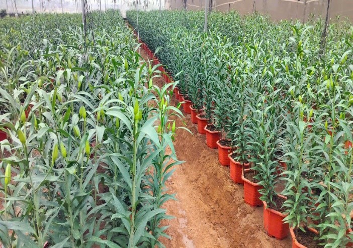 Không chỉ tập trung vào cây ăn quả, dự án còn đầu tư lớn vào sản xuất hoa chất lượng cao. Các loại hoa được lựa chọn gồm tulip, lily, đồng tiền, cúc, lay ơn – đều là những giống có giá trị kinh tế cao, thường được sử dụng trong dịp lễ Tết và nhu cầu trang trí đô thị. Tổng diện tích hoa trồng trong nhà lưới và ngoài đồng ruộng lên tới hơn 6,6 ha trong 2 năm, sản xuất trên 340.000 cây hoa thành phẩm. Trong đó, tỷ lệ cây đạt chất lượng luôn ở mức rất cao: tulip đạt 94%, lily từ 96–98%, hoa đồng tiền và cúc gần như đạt tuyệt đối (99–100%).